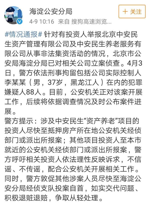 4月9日上午,北京海淀公安分局官方微博发布了一则关于“中安民生”的通报情况通报,通报显示:针对有投资人举报北京中安民生资产管理有限公司及中安民生养老服务有限公司从事非法集资活动的情况,北京市公安局海淀分局已对相关公司立案侦查。4月3日,警方依法刑事拘留包括公司实际控制人李某某(男,37岁,黑龙江人)在内的犯罪嫌疑人88人。目前,公安机关正对该案开展工作,后续将依据调查情况及时公布案件进展。