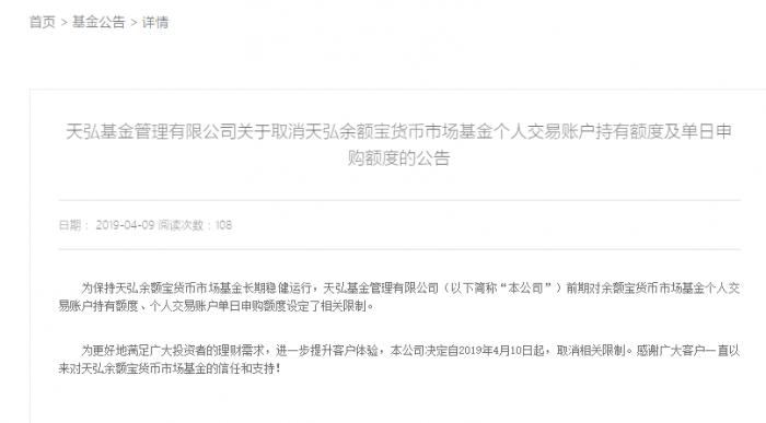 4月9日晚间,天弘基金管理有限公司发布公告称,将于4月10日起取消天弘余额宝货币市场基金个人交易账户持有额度及单日申购额度限制。即投资者购买天弘余额宝货币基金将不再受到单日2万元的申购额度限制和个人最高持有10万元的额度限制。余额宝最新的7日年化收益率为2.306%。