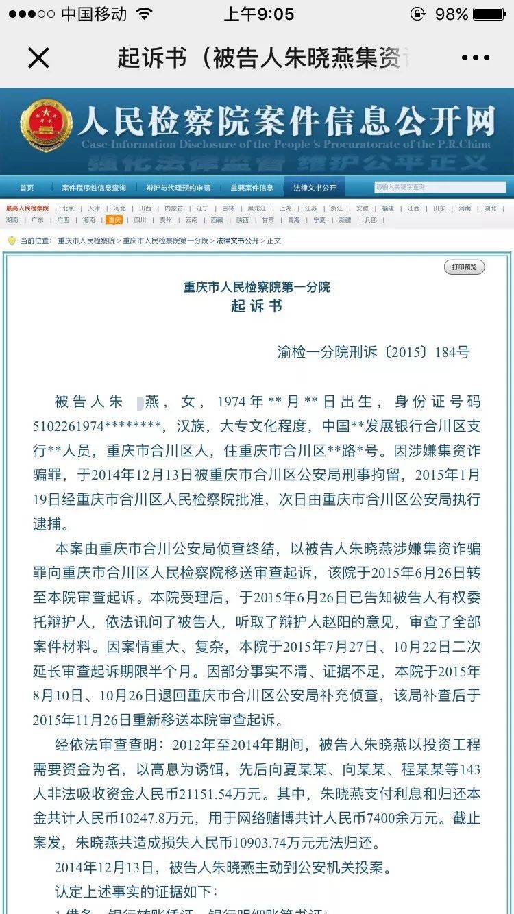 据人民检察院案件信息公开网披露的起诉书显示,1974年出生的朱某燕原为农发行重庆市合川支行员工,早在2016年因涉嫌非法吸收资金人民币逾2亿元获刑。