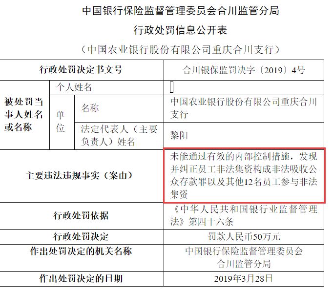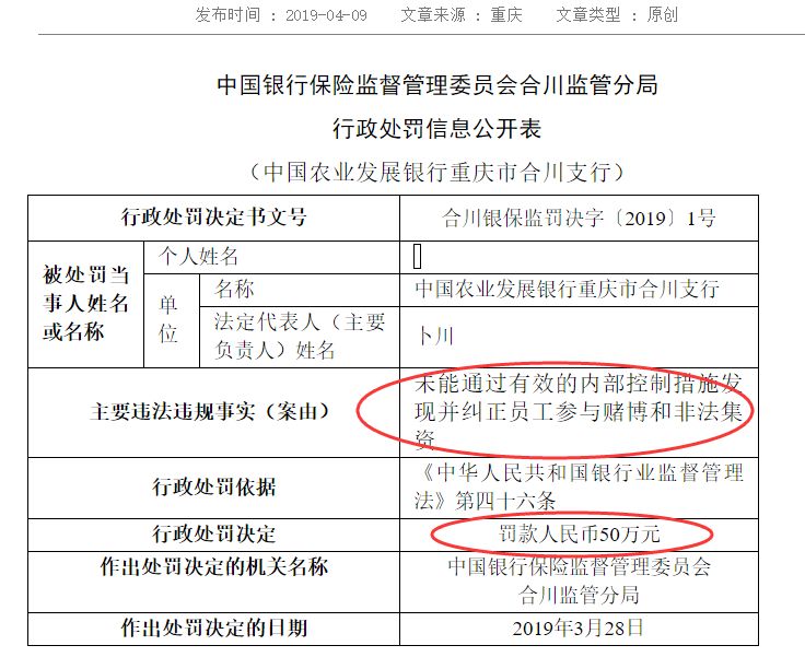 合川银保监分局对于未能通过有效的内控措施发现并纠正员工参与赌博和非法集资的农发行重庆市合川支行,作出处以罚款人民币50万元的决定。