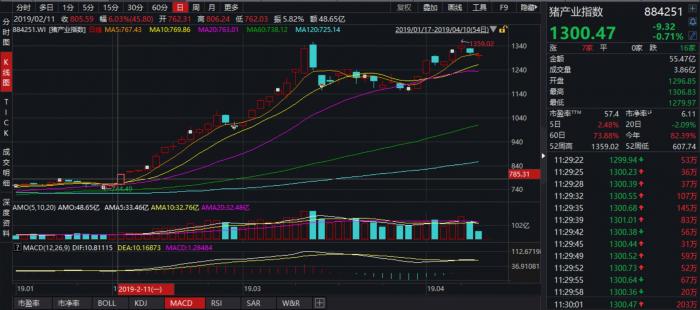 实际上,进入农历猪年来,猪产业指数一直处于快速上涨通道。Wind资讯数据显示,猪产业指数从2月11日开盘的762.31点,已上涨至4月10日午间收盘的1300.47点,上涨幅度高达70.60%。