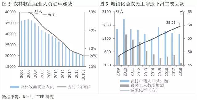 “城镇化”是农民工增速下滑的主要原因。根据国家统计局的定义,农民工是“户籍在农村,在本地从事非农产业或外出从业6个月以上的劳动者”,会影响农民工增速下滑并接近0增长的主要原因即本地农民工就业选择转向农业或者农村户籍人口减少。然而,我国第一产业(农林牧渔)就业人员自2002年以来进入下行阶段,本地农民工转向农业就业带来的影响较小;相比之下,随着城镇化进程的逐步展开,自1998年以来我国农村户籍人口每年减少1千万以上,“城镇化”是农民工增速下滑的主要原因。