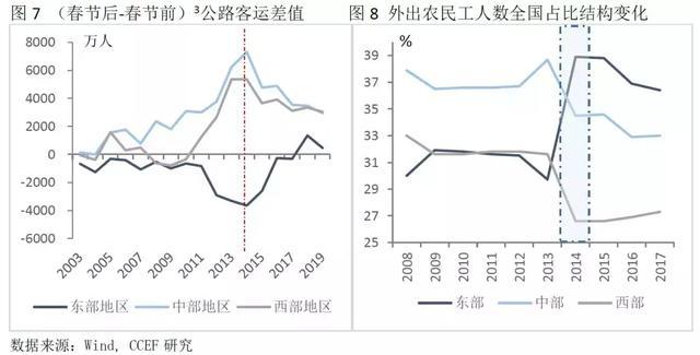 2014年以后,中西部地区与东部地区(春节后-春节前)公路客运差值呈反向走势,东部地区外出农民工输出有所增加,而中西部地区外出农民工输出增量下降(图7)。与此同时,统计数据显示,自2014年起,东部地区成为全国外出农民工主要输出地,中西部外出农民工占比下滑,返乡就业趋势初现。