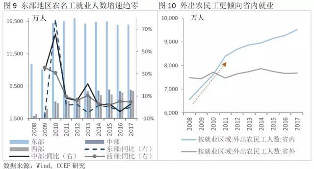 尽管东部地区仍为农民工就业首选之地,但受2008年金融危机影响,外出农民工省内就业人数开始呈现快速增长。自2011年以来,在农民工总人数增速不断下滑的大背景下,东部地区农民工就业人数增速维持低增长或负增长,而中西部地区农民工就业人数增速持续高于东部地区。这跟东部地区劳动力成本上升之后的产业转移密切相关,随着劳动密集型产业向中西部迁移,中西部地区农民工在省内就业的机会不断增加,中西部就业人数长期呈正增长佐证了这一点。