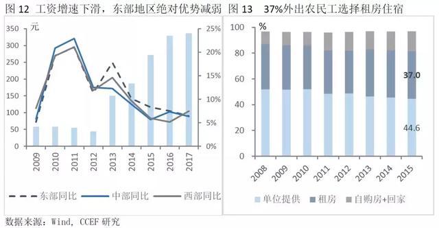 自2013年以来,农民工工资增速开始逐步下滑,东部相较于中西部工资水平的优势在逐渐减弱。同时, 37%的外出农民工通过租房解决住宿问题,一线城市不断上涨的房租以及较高的消费水平,对冲了东部地区的工资优势,这也是驱使农民工返乡就业的重要原因。