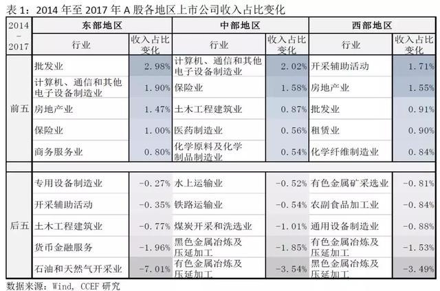 2014年至2017年A股上市公司收入占比变化显示,东部地区受高房价、高人力成本及高环保成本影响,部分传统工业企业收入占比下降,而高端服务业和高端制造业的收入占比提高。受供给侧改革影响,中西部地区高耗能高污染产能过剩行业逐渐转型或退出,收入占比大幅下降;同时由于承接了东部地区部分产业的转移,高端制造业、金融业和房地产行业的收入占比有所提高。