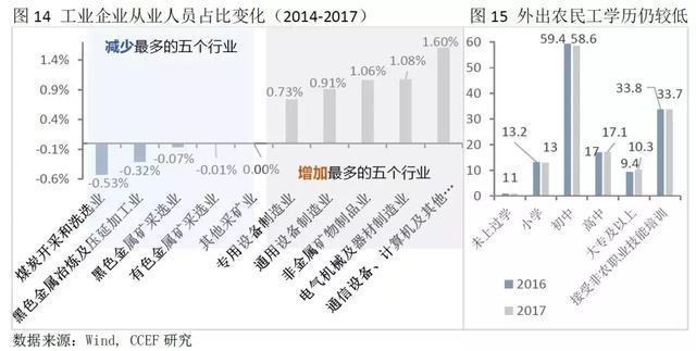 从农民工就业的行业结构来看,制造业和建筑业就业人数占比分别为29.9%、18.9%。由于制造业产业转型升级是工业企业发展的长期目标,低端制造行业向自动化、智能化和高效率转型造成低技术含量岗位被挤出。加上供给侧改革的影响,煤炭及金属冶炼等行业从业人员占比减少,该类行业主要聚集于具有资源属性的中西部地区,导致农民工转向其他行业或返乡;而承接东部地区转移过来的计算机、电气机械、专用设备等高端制造业对从业人员的学历要求较高,并没有给农民工带来增量就业机会。