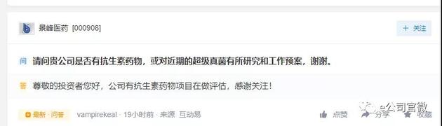 翻查互动平台,近期针对“超级真菌”的提问持续增加,包括景峰医药、恒瑞医药、寿仙谷、海正药业、亚泰集团均被投资者提问。其中只有景峰医药4月10日进行了回复,称公司有抗生素药物项目在做评估。