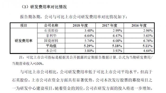 2016年公司的研发费用占比4.64%、2017年公司的研发费用占比3.92%,而到了2018年公司研发费用占营业收入的比重已经降至3.8%。