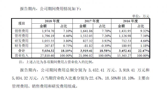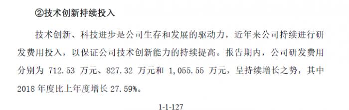 根据招股说明书显示,报告期内公司研发费用分别为712.53万元、827.32万元和1,055.55万元,呈持续增长之势,其中2018年度比上年度增长27.59%。可以看到作为一家“科创”企业,即便研发费用连年增长,但2018年的研发总费用依旧只有1000万出头。