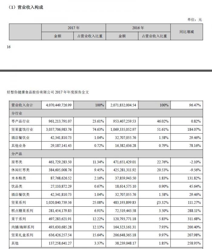 好想你2017年年报显示,公司为中国红枣行业的龙头企业、是红枣行业中上市的唯一企业,多年来牢牢占据红枣行业第一的位置。旗下核心品牌有“好想你”、“百草味”、“枣博士”等。