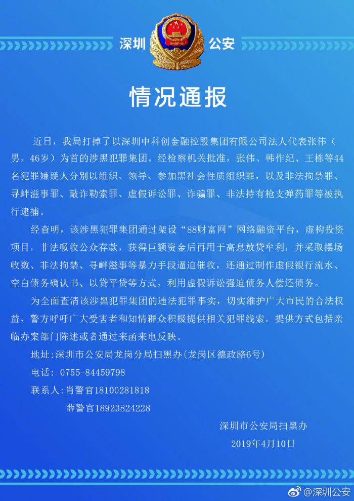 通报来自4月10日下午“深圳公安”发布的微博信息:“近日,我局打掉了以深圳中科创金融控股集团有限公司(以下简称‘中科创金控’)法人张伟(男、46岁)为首的涉黑犯罪集团”。