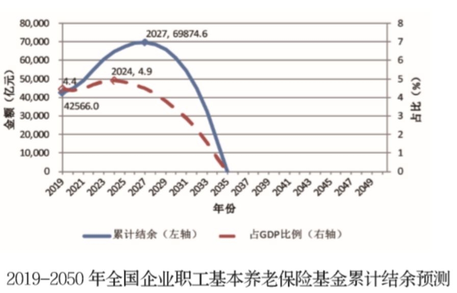 《报告》进一步分析认为,2019年全国城镇企业职工基本养老保险基金累计结余为4.26万亿元,此后持续增长,到2027年将达到峰值6.99万亿元,此后将开始迅速下降,并可能在2035年前后耗尽累计结余。