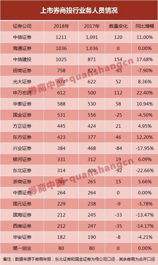 从这20家券商披露情况来看,投行人数从9545人增至9791人,增加246人,增幅2.58%。