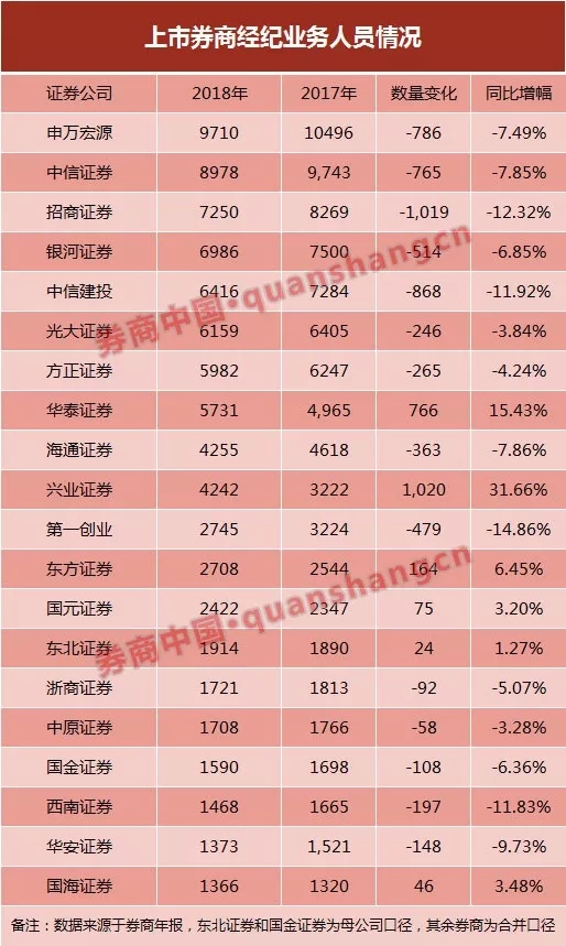 按中国证券业协会披露数据,至4月10日,券业总人数33.10万人,较2018年初的34.2万,减少了11357人,降幅达3.32%。由于证券业协会数据为母子分离口径,各家人员情况以年报数据为准。