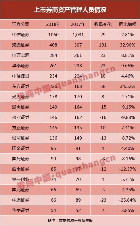 资管新规背景下,券商资管正在向主动型管理转型。从披露数据来看,多家券商的资管人员在增加,增员数量看,海通证券资管增员101人,同比增幅32.90%;同比增幅来看,东证资管增量58人,同比增幅34.52%。