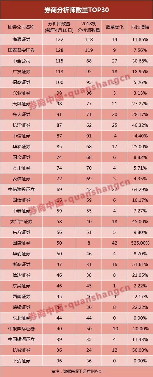 增员情况来看,国盛证券表现最为突出,去年初分析师仅8人,至今年4月10日,分析师数量50人,增加数倍;中金公司、中信建投分析师数量均增加27人;长江证券分析师增25人。