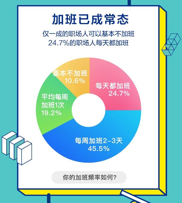 《报告》同时指出,只有10.6%的职场人基本不加班,近九成的人都难逃加班命运。其中45.5%的职场人每周加班2到3天,更有24.7%的人几乎每天都在加班。