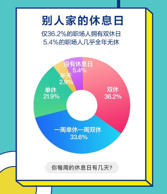 休息权是劳动者的法定权利,但仅有36.2%的职场人拥有双休日。另有33.6%的职场人享有“准双休日”,即一周单休,一周双休。此外,有5.4%的职场人没有固定的休息日,几乎全年无休。