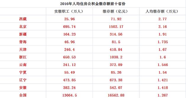 比如,2016年西藏以人均缴存2.77万元成为2016年全国人均缴存住房公积金最高的地区,而当年上海和广东没有进入前十。