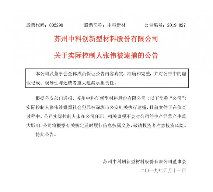 上市公司中科新材(002290)今日早间发布公告称,根据公安部门通报,苏州中科创新型材料股份有限公司(以下简称:中科新材)实际控制人张伟涉嫌黑社会犯罪被深圳市公安机关执行逮捕,目前案件正在侦查过程中。公司实际控制人未在公司任职,相关事项不会对公司的生产经营产生重大影响。
