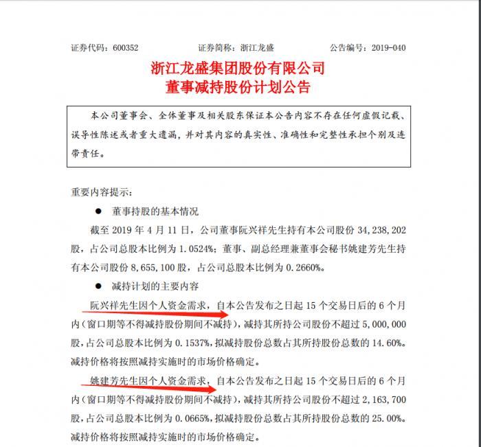 4月11日晚,浙江龙盛发布减持公告,公司董事阮兴祥,及董事、副总经理兼董事会秘书姚建芳拟减持公司股票。