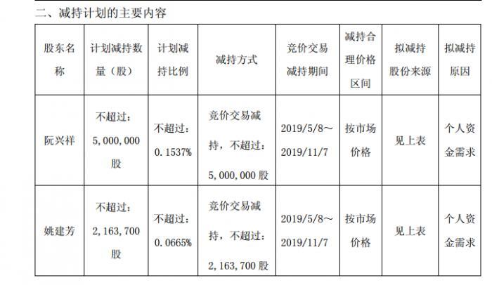 其中,阮兴祥现任公司副董事长,计划减持其所持公司股份不超过500万股,姚建芳拟减持其所持公司股份不超过216.37万股。