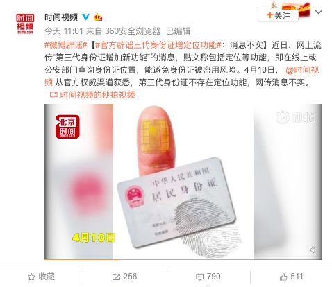 4月10日,@时间视频 从官方权威渠道获悉,第三代身份证不存在定位功能,网传消息不实。
