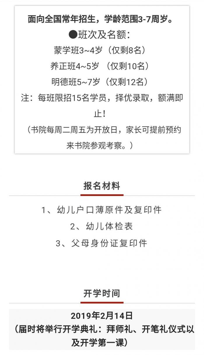 今年1月,湖南郴州一家书院就打出广告招收国学私塾班,招收班次除了面向学龄前儿童的蒙学班、养正班,还有面向5-7岁学龄儿童的明德班。