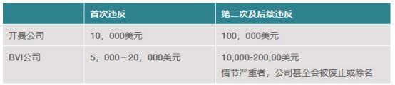 当地税务机关将负责认定相关个体是否通过经济实质性测试;无法通过经济实质性测试之相关个体,当地税务机关除通知并指正外,还可能要求该个体缴纳高达数万美元之罚款(见下表),情节严重者,甚至可以注销其登记。