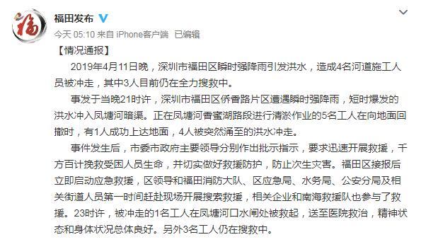 此前,根据“福田发布”通报的消息,11日晚23时许,被冲走的4名施工人员中,有1名在凤塘河口水闸处被救起,送至医院救治,精神状态和身体状况总体良好。