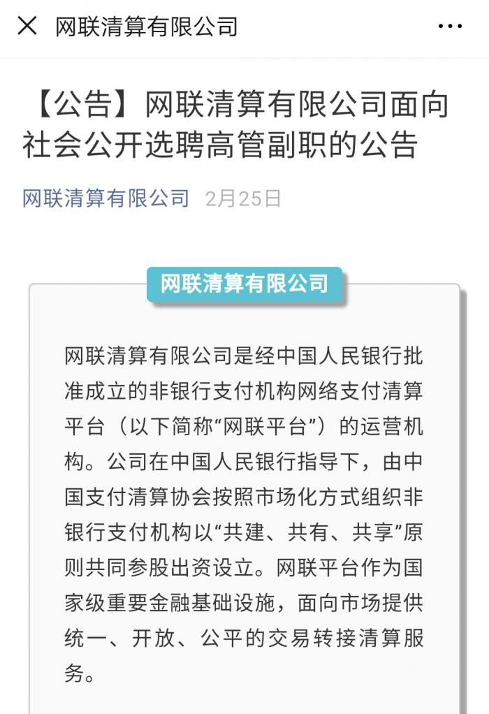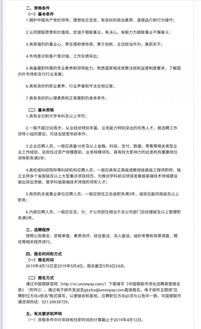 4月12日,银联员工的朋友圈纷纷转发《中国银联高级管理人员市场化选聘公告》。