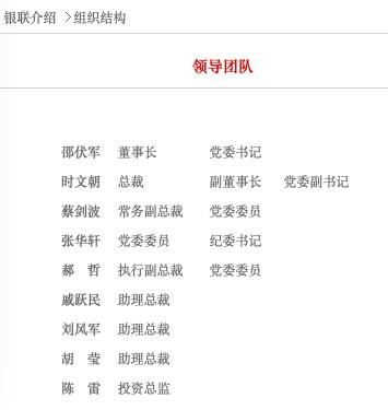 目前,银联领导团队共有9人,邵伏军担任党委书记、董事长,时文朝担任党委副书记、总裁,其他三人还担任党委委员,包括执行副总裁郝哲。