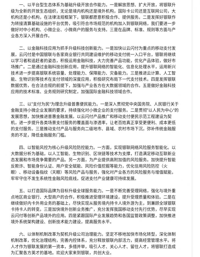 第六个即是,以体制机制改革为契机升级公司治理能力。坚定不移地加快市场化转型,深化体制机制改革,优化治理结构,完善内控体系,充分释放银联内部活力,提高经营管理水平。将人才作为银联发展的第一资本,多措并举,吸引人才、关心人才、留住人才,将银联打造成为汇聚各方英才的基地。欢迎大家来到银联,共创大业。