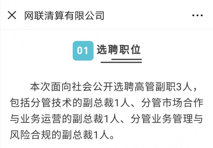 今年2月25日,网联面向社会公开选聘高管副职,本次面向社会公开选聘高管副职3人,包括分管技术的副总裁1人、分管市场合作与业务运营的副总裁1人、分管业务管理与风险合规的副总裁1人。