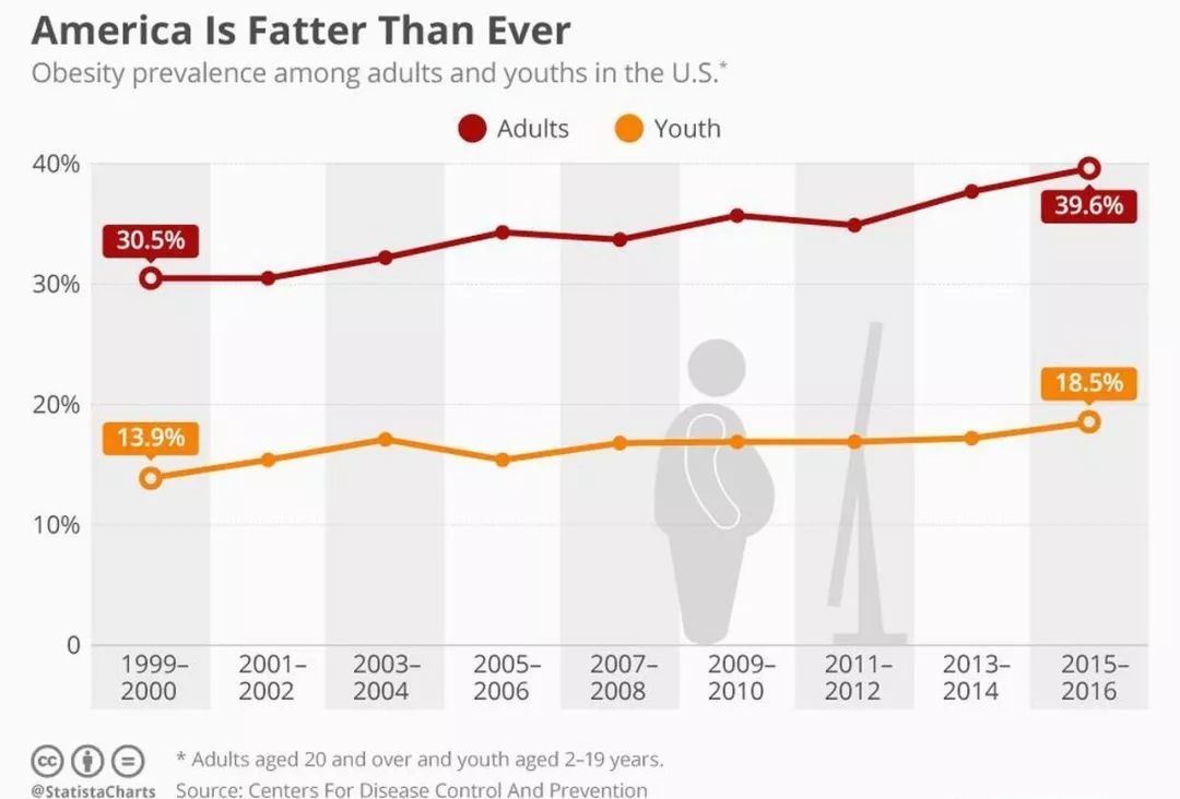 美国人肥胖率:红色为成年人,橙色为年轻人