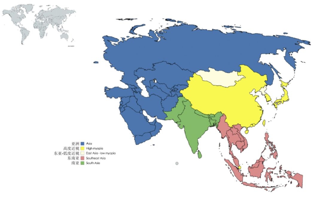 亚洲近视人群分布,黄色为高度近视高发国家和地区