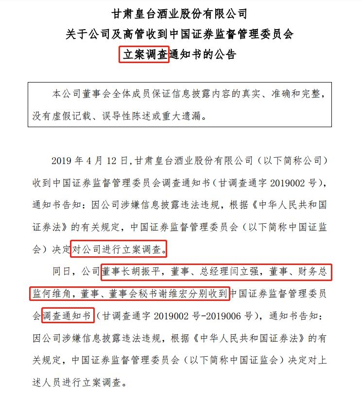 与公司一同被立案调查的还有*ST皇台的数名董事、高管,包括公司董事长胡振平,董事、总经理闫立强,董事、财务总监何维角以及董事、董事会秘书谢维宏,被调查原因同样是由于公司涉嫌信息披露违法违规。