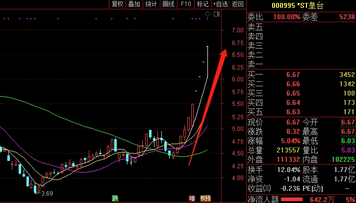 截至昨日收盘,*ST皇台涨5.04%,股价报6.67元,成交额1.4亿元,换手率12%;股价连续第6天涨停;虽然连续涨停,但总市值仍然只有11.83亿元,为A股市值第二低。