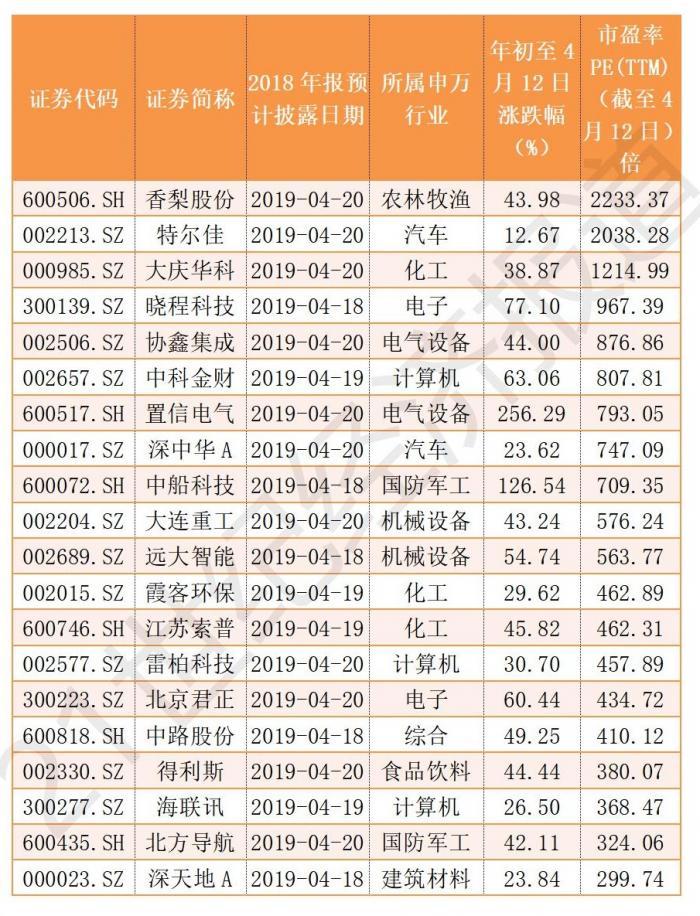 497家上市公司中,截至4月12日滚动市盈率最高的为香梨股份,为2233.37倍。特尔佳、大庆华科滚动市盈率也超千倍。
