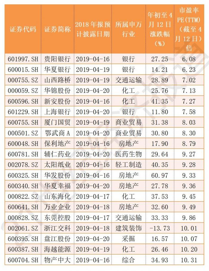 497家上市公司中,截至4月12日滚动市盈率最低的20家均不超过11倍,所属行业以房地产和化工居多。