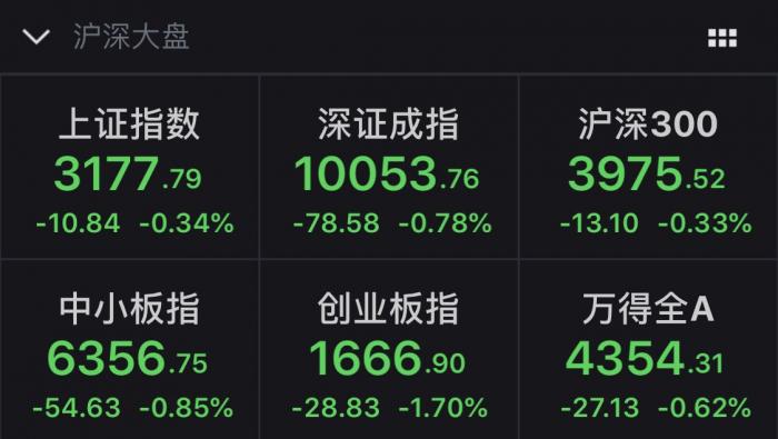 截至收盘,上证综指收跌0.34%报3177.79点,盘中涨超2%;深成指跌0.78%报10053.76点;创业板指跌1.7%报1666.9点,盘中涨1.8%。其中,汽车、传媒、券商等跌幅较大。