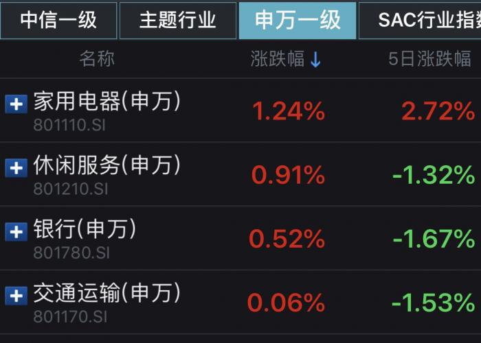 截至当日收盘,申万一级行业板块中,仅四大板块收红,分别是家用电器、休闲服务、银行、交通运输。其中,银行板块的上涨是沪指跌幅显著小于创业板指跌幅的重要原因。不过,银行股尾盘的走弱,也预示了其“单骑救主”的失败。