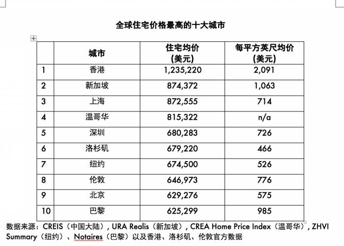 香港蝉联“全球房价最高城市”榜首,而上海、深圳、北京分列第三、第五和第九名。