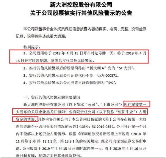新大洲A今日晚间连发数则公告,披露了公司第一大股东的关联企业恒阳牛业占用公司资金4.8亿元的情形。公司表示,预计在一个月内不能解决上述资金占用情形,因此将于2019年4月16日(周二)开市时起实行其他风险警示,即被ST。
