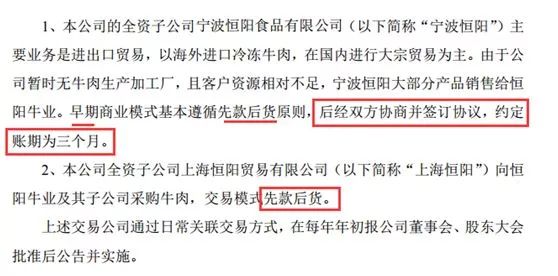 A、新大洲A的全资子公司宁波恒阳食品有限公司(以下简称“宁波恒阳”)主要业务是进出口贸易,以海外进口冷冻牛肉,在国内进行大宗贸易为主。由于新大洲A暂时无牛肉生产加工厂,且客户资源相对不足,宁波恒阳大部分产品销售给恒阳牛业。早期商业模式基本遵循先款后货原则,后经双方协商并签订协议,约定账期为三个月。 B、新大洲A全资子公司上海恒阳贸易有限公司(以下简称“上海恒阳”)向恒阳牛业及其子公司采购牛肉,交易模式先款后货。