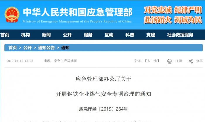 近日,应急管理部印发了《应急管理部办公厅关于开展钢铁企业煤气安全专项治理的通知》(以下简称《通知》),定于2019年4月至11月在全国开展钢铁企业煤气安全专项治理。