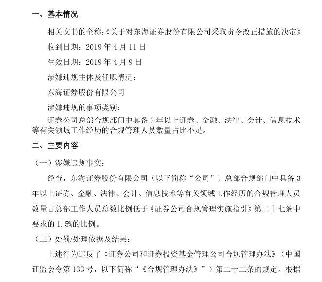 近日,东海证券因总部合规管理人员比例不符合要求被江苏证监局采取责令改正措施。