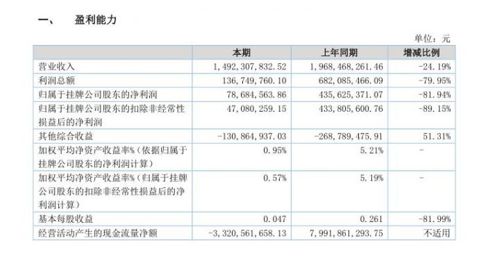 数据显示,公司报告期内实现营业收入14.92亿元,同比下滑24.19%;实现归母净利润7868.46万元,同比下滑81.94%。
