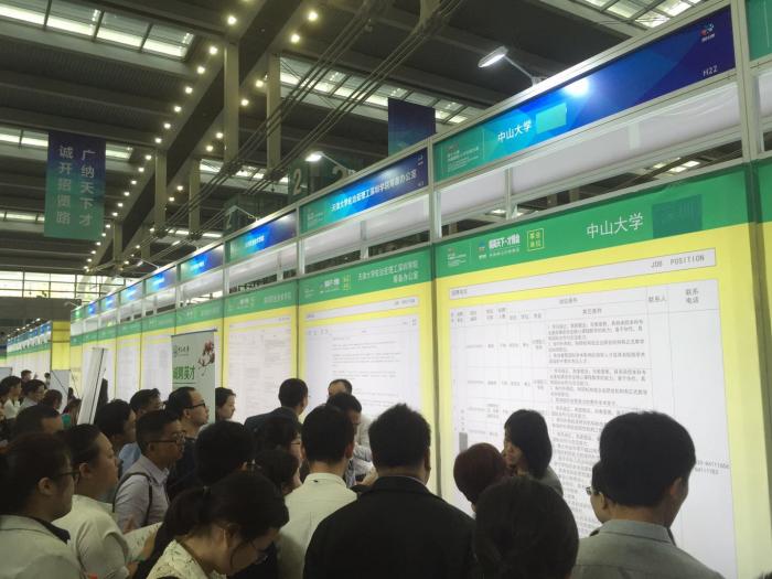 (中山大学(深圳)展台前,求职者在查阅招聘职位)